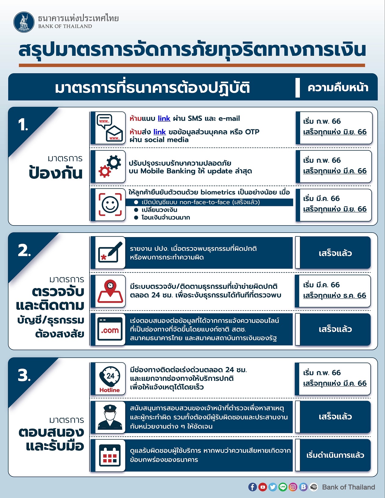 1. ด้านการป้องกัน เพื่อปิดช่องทางที่มิจฉาชีพจะเข้าถึงประชาชน โดยการยกเลิกส่งลิงก์ทุกประเภทผ่าน SMS อีเมล และงดส่งลิงก์ขอข้อมูลสำคัญ จำกัดบัญชีผู้ใช้งาน Mobile Banking ของแต่ละสถาบันการเงิน ใช้ได้แค่ 1 บัญชีต่อ 1 สถาบันเท่านั้น มีการนำเทคโนโลยีเปรียบเทียบข้อมูลอัตลักษณ์ส่วนบุคคล (Biometrics) มาใช้ยืนยันตัวตนเมื่อต้องทำธุรกรรมผ่าน Mobile ฺBanking โอนขั้นต่ำ 50,000 บาท