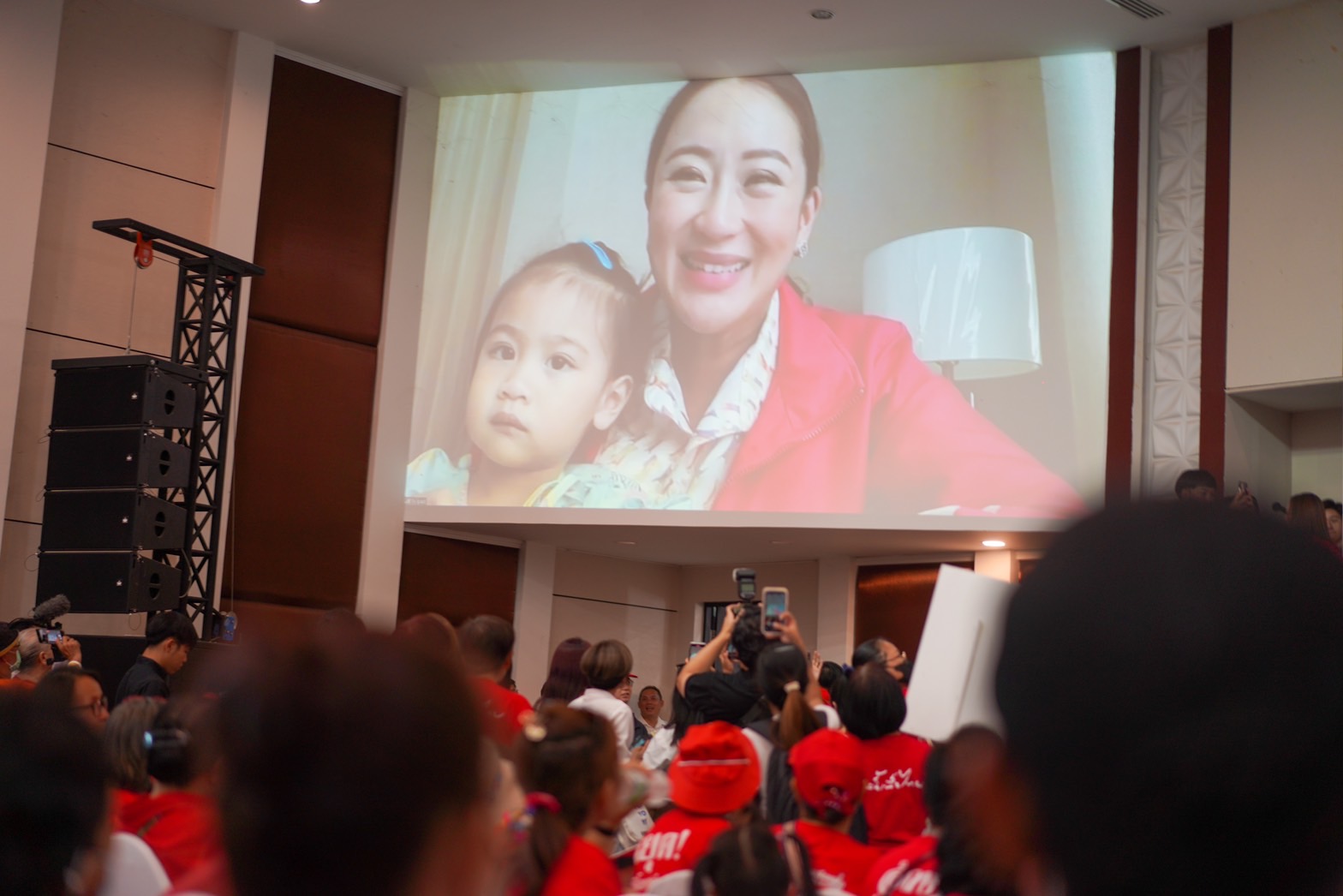 ขณะที่ น.ส.แพทองธาร ชินวัตร หัวหน้าครอบครัวเพื่อไทย แคนดิเดตนายกรัฐมนตรีพรรคเพื่อไทย วิดีโอคอลมาปราศรัยในเวทีปราศรัยใหญ่วันนี้ด้วย โดยก่อนเริ่มปราศรัย น.ส.แพทองธาร ได้นำน้องธิธาร บุตรสาวที่กำลังรักษาอาการป่วยด้วยไวรัส RSV มาทักทายประชาชนที่อยู่ภายในสาเกตฮอลล์ พร้อมระบุว่า ธิธารกำลังไม่สบาย รักษาตัวอยู่ที่โรงพยาบาล ส่วนตนก็ติดไข้หวัดจากลูกสาว โดยให้น้องธิธารโบกมือทักทายประชาชนด้วย