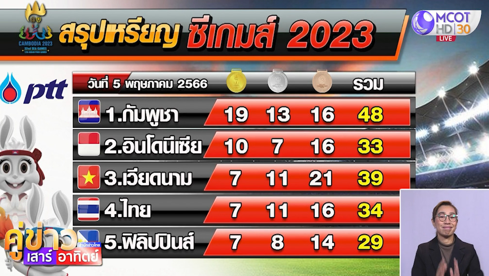 สรุปเหรียญทองกัมพูชา ยังนำเป็นอัน 1 คว้า 19 เหรียญทอง 13 เหรียญเงิน 16 เหรียญทอง ส่วนไทยอยู่อันดับ 4 คว้า 7 เหรียญทอง 11 เหรียญเงิน 16 เหรียญทองแดง.-สำนักข่าวไทย