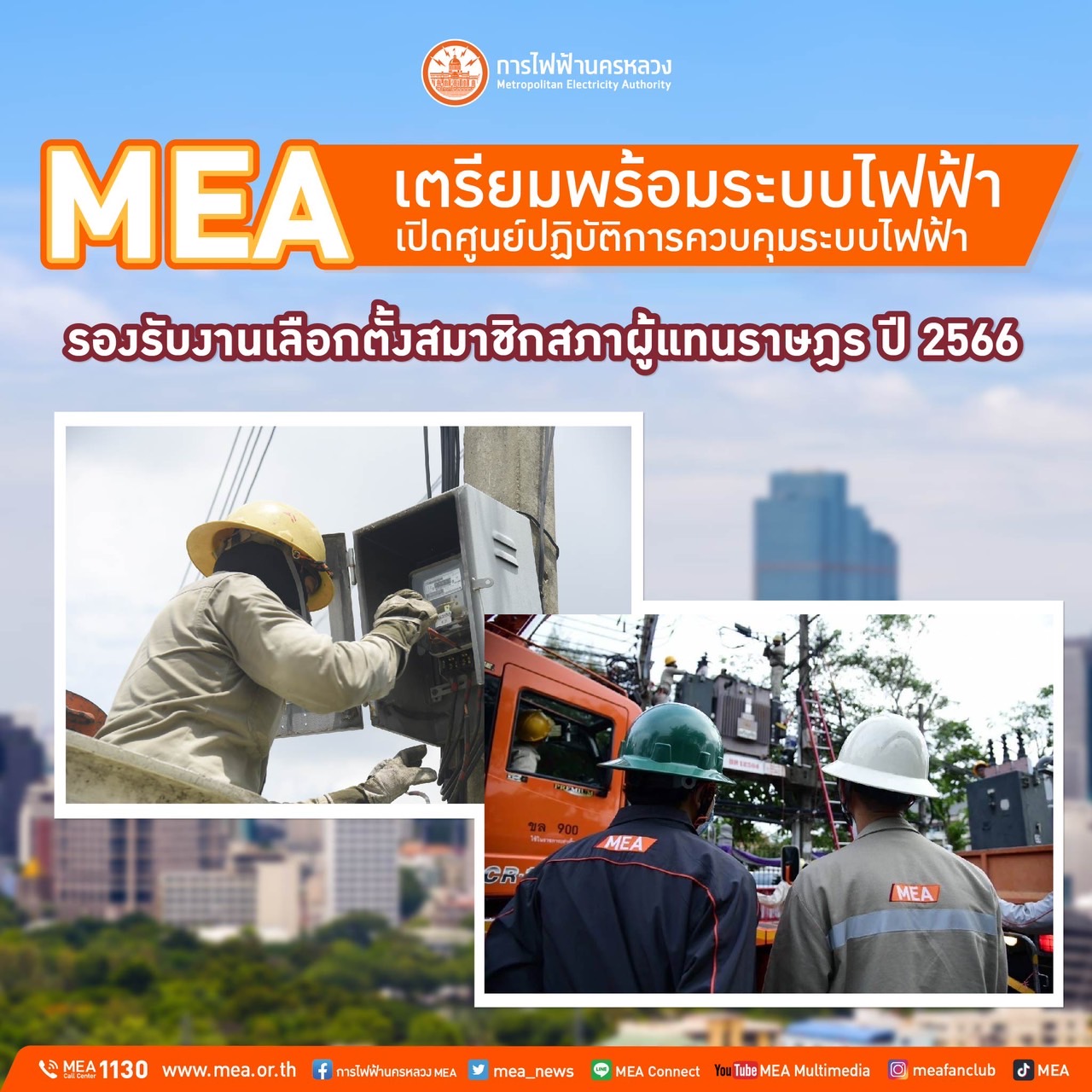 วันนี้ (11 พฤษภาคม 2566) นายพิพัฒน์ ชลอำไพ รองผู้ว่าการ MEA หรือการไฟฟ้านครหลวง เปิดเผยว่า MEA ในฐานะหน่วยงานรัฐวิสาหกิจสังกัดกระทรวงมหาดไทย มีหน้าที่ดูแลระบบจำหน่ายไฟฟ้าในพื้นที่กรุงเทพมหานคร นนทบุรี และสมุทรปราการ MEA ดูแลความพร้อมระบบไฟฟ้าสถานที่จัดการลงคะแนนการเลือกตั้งสมาชิกสภาผู้แทนราษฎร (ส.ส.) โดยมีนายวิลาศ เฉลยสัตย์ ผู้ว่าการ MEA เปิดศูนย์ปฏิบัติการควบคุมระบบไฟฟ้า การไฟฟ้านครหลวง รองรับงานเลือกตั้งสมาชิกสภาผู้แทนราษฎร (ส.ส.) อย่างเป็นทางการ ในวันที่ 14 พฤษภาคม 2566 ณ อาคารวัฒนวิภาส การไฟฟ้านครหลวง สำนักงานใหญ่ คลองเตย นายทวีศักดิ์ สมานสิน ผู้ช่วยผู้ว่าการ MEA เป็นหัวหน้าประจำศูนย์ปฏิบัติการควบคุมระบบไฟฟ้าฯ