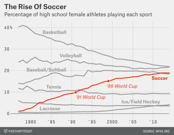 กีฬาที่ได้รับอานิสงส์จากกฎหมาย Title IX มากที่สุดคือกีฬาฟุตบอล เมื่อพบว่าสัดส่วนนักกีฬาหญิงในกีฬาฟุตบอลทั้งระดับไฮสคูลและมหาวิทยาลัยเพิ่มขึ้นอย่างมาก ส่งผลต่อการพัฒนานักกีฬาระดับทีมชาติ และมีส่วนทำให้ทีมฟุตบอลหญิงทีมชาติสหรัฐอเมริกากลายเป็นทีมชั้นนำของโลก ครองอันดับ 1 จากการจัดอันดับ FIFA ranking อย่างยาวนานตั้งแต่เดือนมิถุนายนปี 2017 จนถึงปัจจุบัน ด้วยสถิติคว้าเหรียญทองโอลิมปิก 4 สมัยและแชมป์โลก 4 สมัย