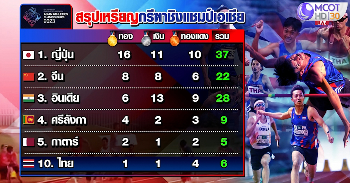 สรุปปิดฉากศึกกรีฑาชิงแชมป์เอเชีย ทีมกรีฑาไทยคว้าไป 1 เหรียญทอง 1 เหรียญเงิน 4 เหรียญทองแดง อันดับ 1 เป็นญี่ปุ่น 16 เหรียญทอง อันดับ 2 เป็นจีน 8 เหรียญทอง อันดับ 3 อินเดีย 6 เหรียญทอง