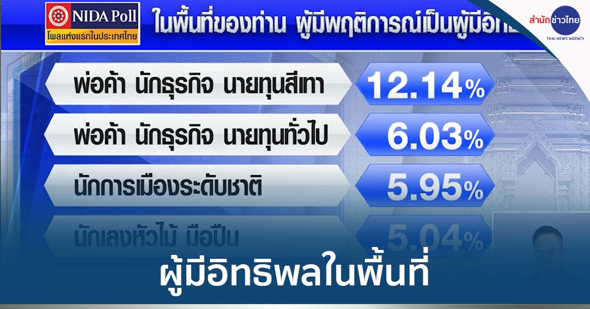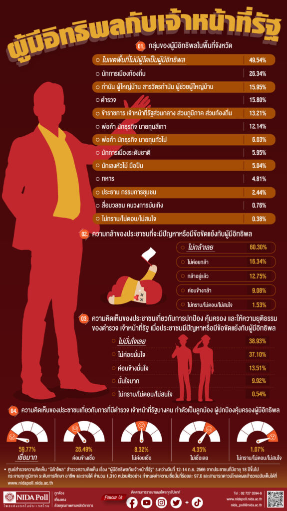 17 ก.ย.-ศูนย์สำรวจความคิดเห็น “นิด้าโพล” เผยผลสำรวจของประชาชนทั่วประเทศ เรื่อง “ผู้มีอิทธิพลกับเจ้าหน้าที่รัฐ” รวมทั้งสิ้น 1,310 ตัวอย่าง เกี่ยวกับผู้มีอิทธิพลในพื้นที่ ทำการสำรวจระหว่างวันที่ 12-14 กั.ย.66 จากประชาชนที่มีอายุ 18 ปีขึ้นไป