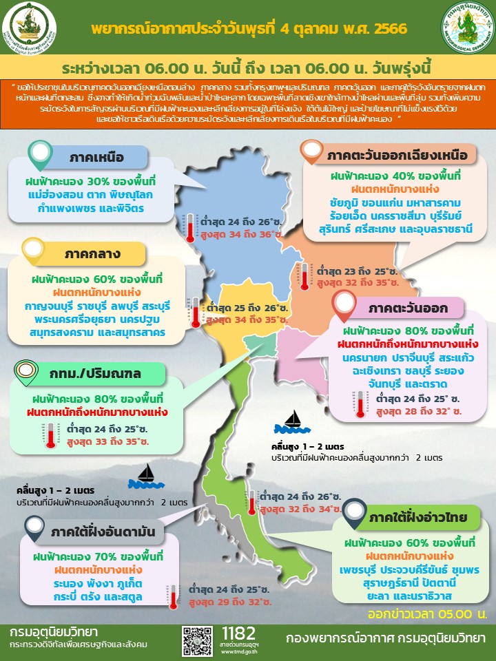 กรุงเทพฯ 4 ต.ค. – อุตุฯ เตือนฝนตกหนักมากบริเวณ กทม.-ปริมณฑล และภาคตะวันออก ฟ้าคะนอง 80% ของพื้นที่ ส่วนภาคอีสานตอนล่าง ภาคกลาง และภาคใต้ มีฝนตกหนักบางแห่ง
