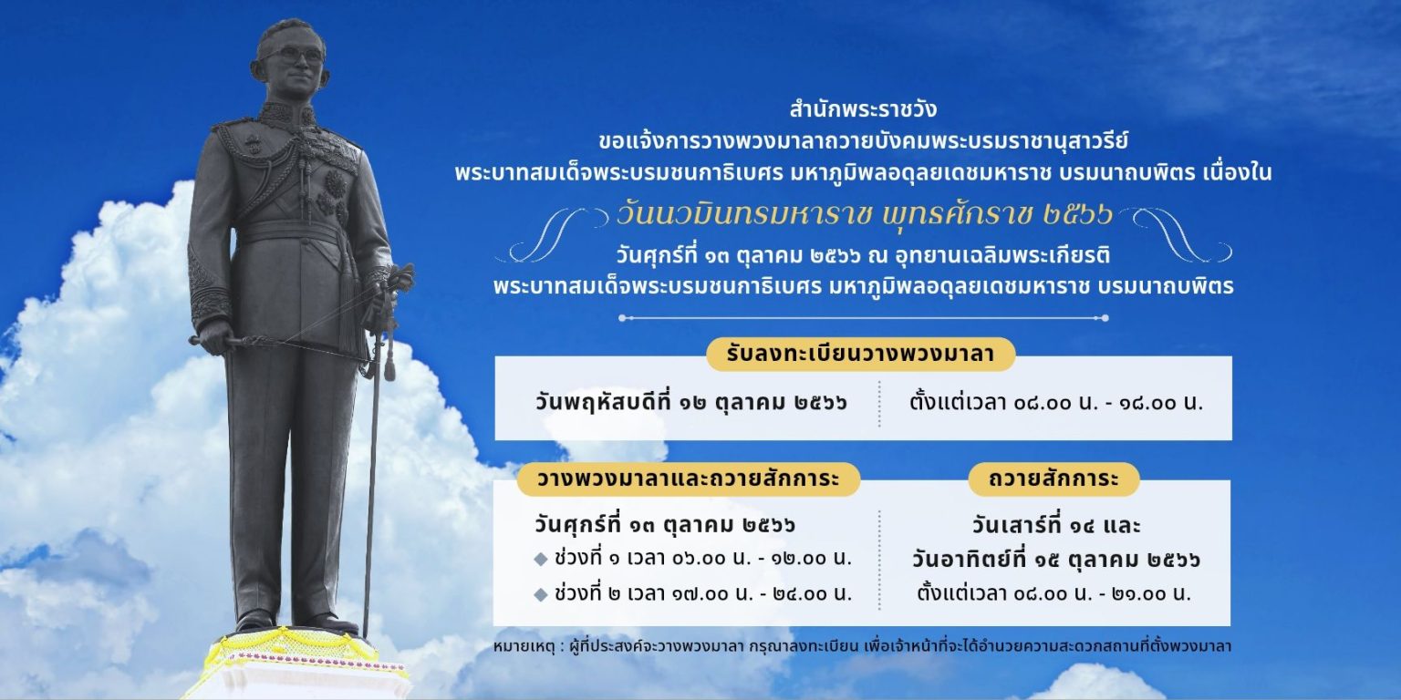 สำนักพระราชวัง ขอแจ้งการวางพวงมาลาถวายบังคมพระบรมราชานุสาวรีย์ พระบาทสมเด็จพระบรมชนกาธิเบศร มหาภูมิพลอดุลยเดชมหาราช บรมนาถบพิตร เนื่องใน “วันนวมินทรมหาราช” พุทธศักราช ๒๕๖๖ ณ อุทยานเฉลิมพระเกียรติพระบาทสมเด็จพระบรมชนกาธิเบศร มหาภูมิพลอดุลยเดชมหาราช บรมนาถบพิตร ในวันศุกร์ที่ ๑๓ ตุลาคม ๒๕๖๖