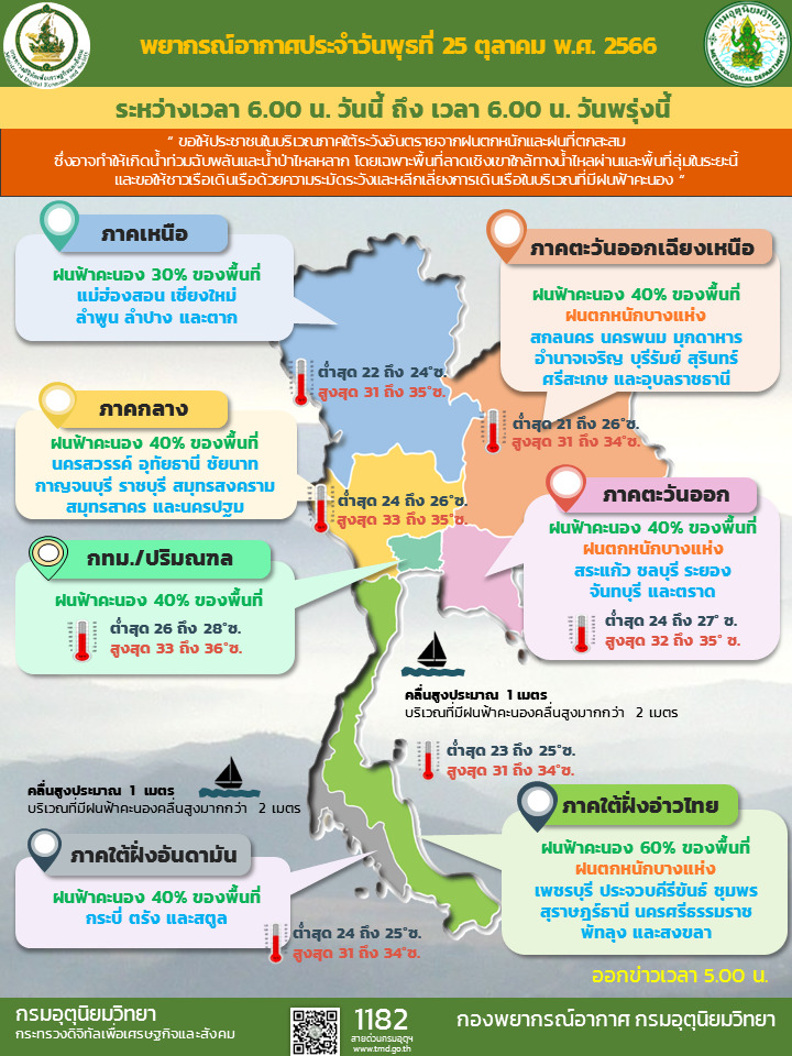 อนึ่ง พายุไซโคลน “ฮอมูน” (HAMOON) บริเวณอ่าวเบงกอลตอนบน และคาดว่าจะเคลื่อนขึ้นฝั่งบริเวณประเทศบังคลาเทศ ในช่วงวันที่ 25–26 ตุลาคม 2566 โดยพายุนี้ไม่ส่งผลกระทบต่อประเทศไทย