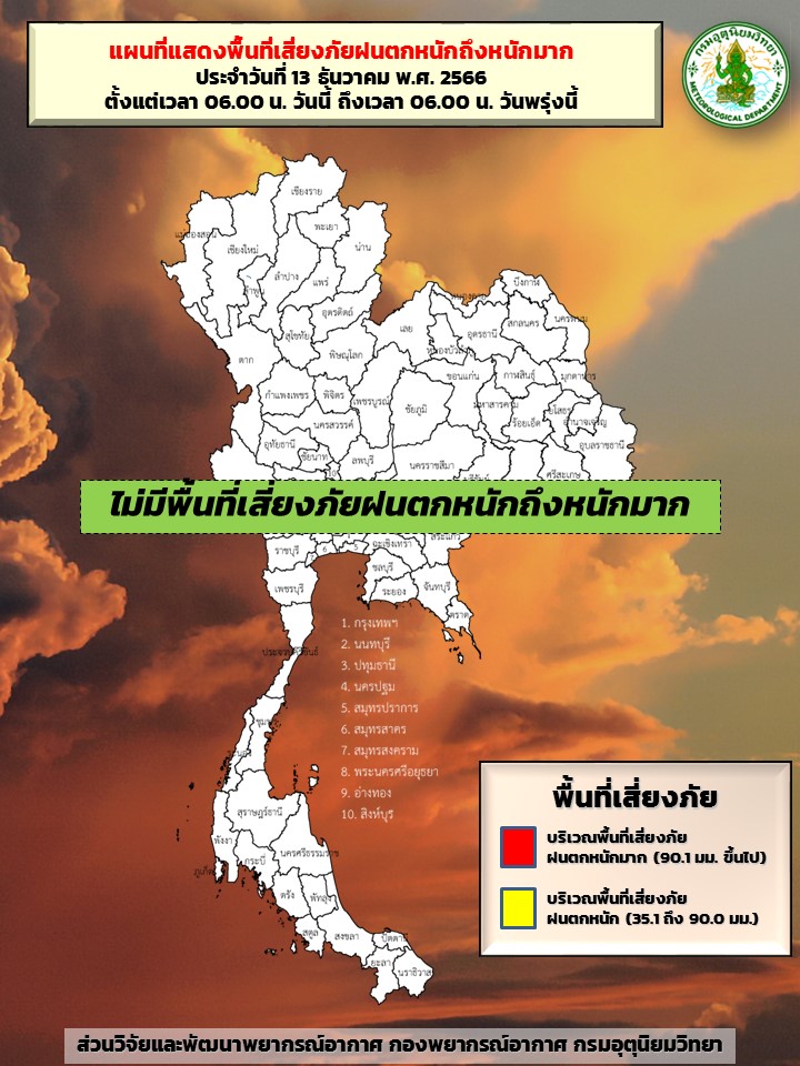 ภาคกลาง อากาศเย็นกับมีหมอกในตอนเช้า อุณหภูมิต่ำสุด 22-24 องศาเซลเซียส อุณหภูมิสูงสุด 34-36 องศาเซลเซียส
