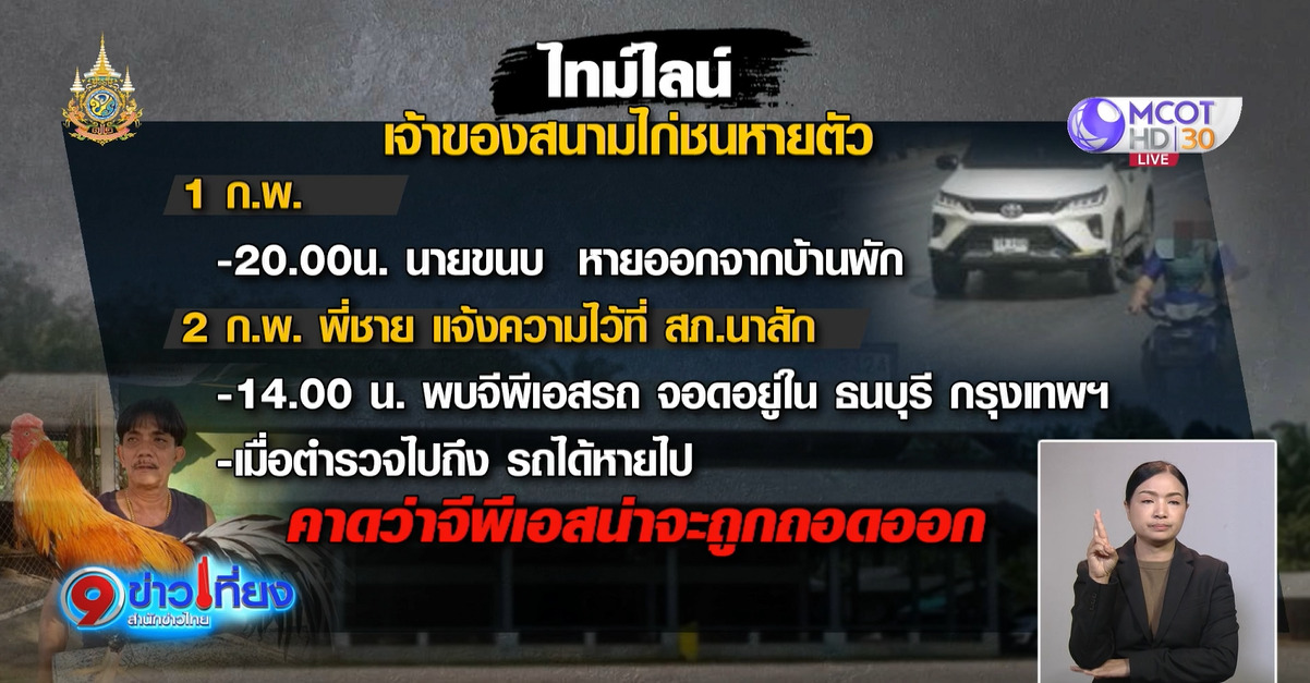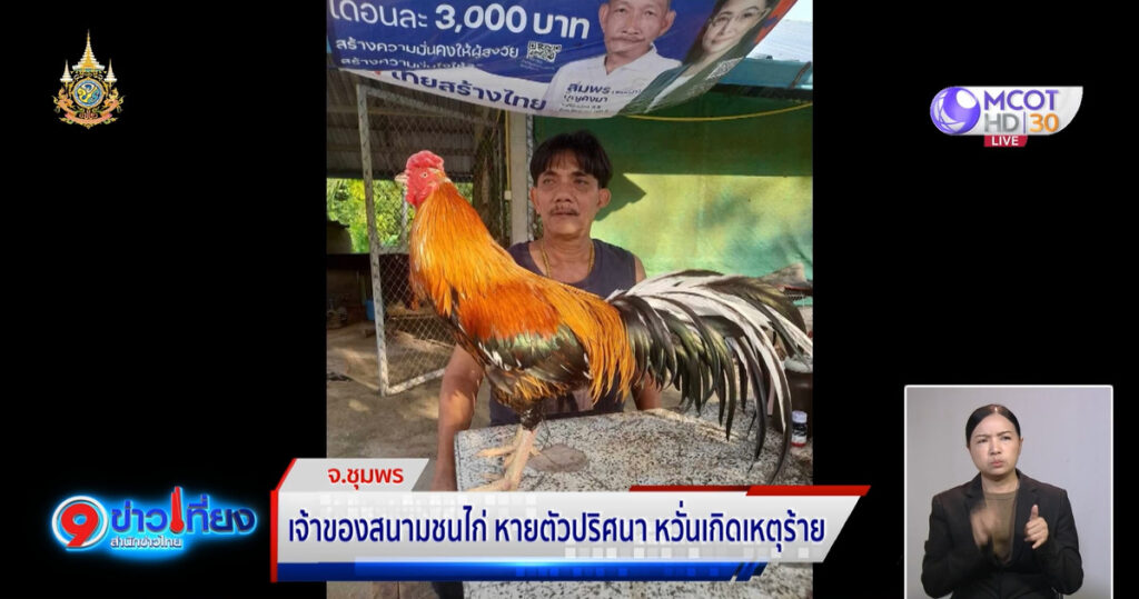 ชุมพร 5 ก.พ. – เจ้าของสนามชนไก่ชุมพร หายตัวปริศนา จีพีเอสจับสัญญาณรถยนต์ขับด้วยความเร็วผิดปกติอยู่แถวภาคกลาง ปลายทางฝั่งธนบุรี ตำรวจเร่งติดตามแต่ยังไร้วี่แวว เผยปมเหตุอาจมาจากปัญหาชู้สาว-การเงิน
