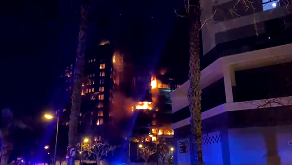 เจ้าหน้าที่ดับเพลิงพยายามควบคุมเพลิงที่โหมลุกไหม้อาคารที่พักอาศัยความสูง 14 ชั้น ในย่านคัมปานาร์ ของเมืองบาเลนเซีย ประเทศสเปน เมื่อช่วงเย็นวานนี้ตามเวลาท้องถิ่น ภาพจากสถานีโทรทัศน์ท้องถิ่น แสดงให้เห็นด้านหน้าของอาคารไฟกำลังลุกไหม้รุนแรงและลุกลามไปยังอาคารข้างเคียง ขณะที่เศษซากที่ถูกไฟไหม้ร่วงหล่นลงไปที่พื้นถนนด้านล่าง และได้ยินเสียงระเบิดอยู่ข้างในอาคาร เช่นเดียวกับผู้คนที่ยืนอยู่บนระเบียงของอาคารเพื่อรอการช่วยเหลือ เชื่อว่าน่าจะมีผู้อยู่อาศัยติดอยู่ภายในอาคารหลายคน