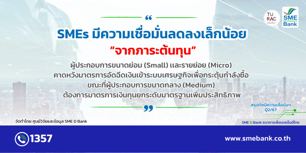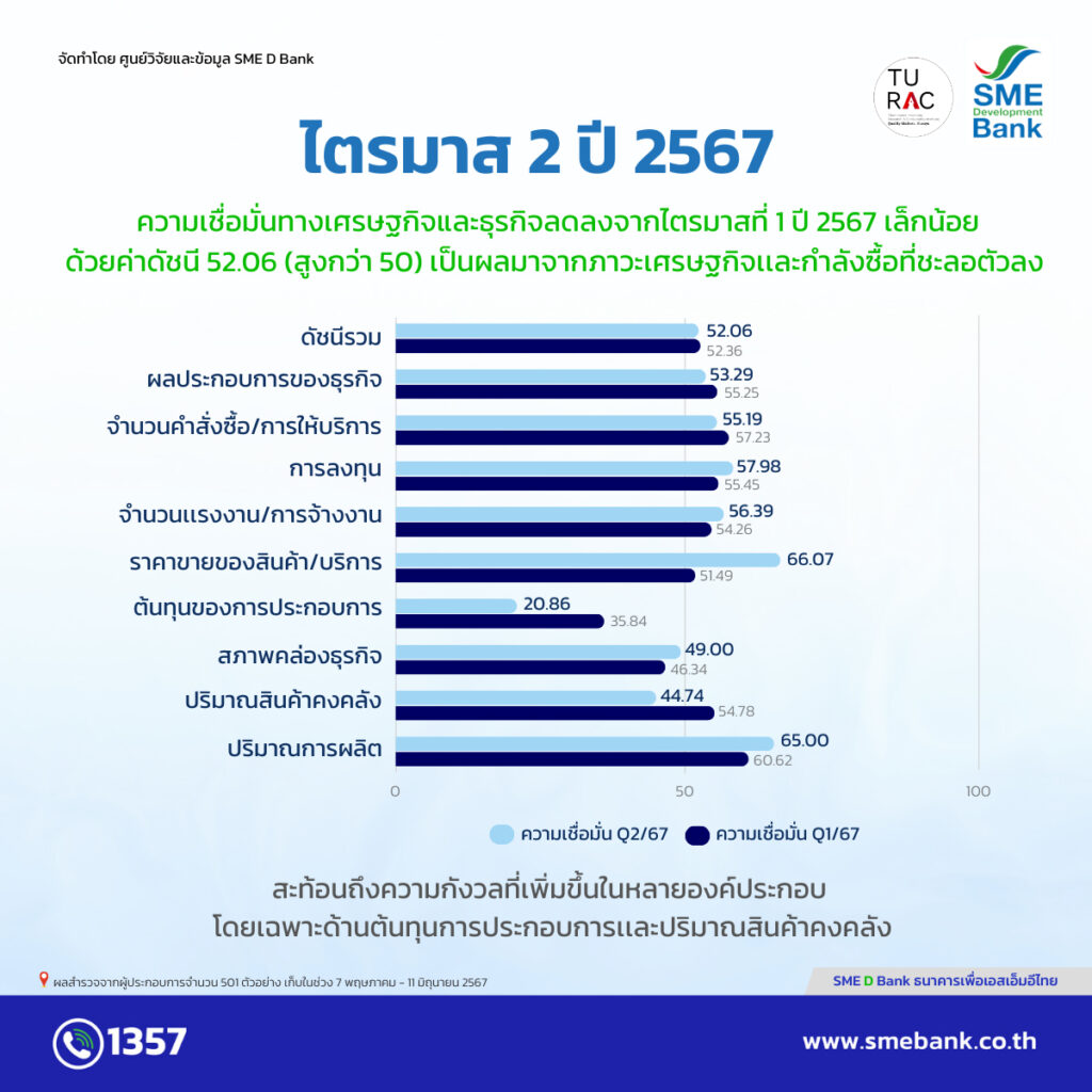 นายพิชิต มิทราวงศ์ กรรมการผู้จัดการ ธนาคารพัฒนาวิสาหกิจขนาดกลางและขนาดย่อมแห่งประเทศไทย (ธพว.) หรือ SME D Bank กล่าวว่า SME D Bank ร่วมกับ ม.ธรรมศาสตร์ พบว่าภาพรวมดัชนีเชื่อมั่นฯ ไตรมาส 2/2567 อยู่ในระดับ 52.06 ปรับตัวลดลงเล็กน้อยจากไตรมาสแรก อยู่ในระดับ 52.36 เนื่องจากเอสเอ็มอี กังวลต้นทุนประกอบการสูงขึ้น ภาวะเศรษฐกิจ ชะลอตัวทั้งเศรษฐกิจในประเทศและเศรษฐกิจโลกนโยบายและมาตรการกระตุ้นเศรษฐกิจของภาครัฐยังขาดความชัดเจน กำลังซื้อของลูกค้าลดลง ปัญหาขาดสภาพคล่องในการดำเนินธุรกิจ