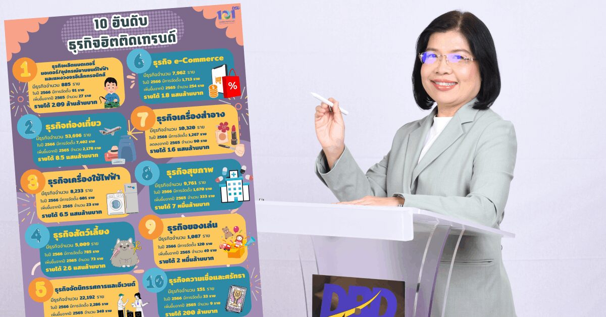 นางอรมน ทรัพย์ทวีธรรม อธิบดีกรมพัฒนาธุรกิจการค้า กระทรวงพาณิชย์ เปิดเผยว่า กรมพัฒนาธุรกิจการค้าได้ติดตามแนวโน้มการจดทะเบียนจัดตั้งธุรกิจใหม่เพื่อวิเคราะห์ทิศทางการเติบโตของธุรกิจในประเทศ ประกอบกับนำข้อมูลการนำส่งงบการเงินประจำปี 2566 (ข้อมูล ณ 30 มิถุนายน 2567) มาวิเคราะห์พบว่า ธุรกิจติดเทรนด์ที่มีการจัดตั้งเพิ่มขึ้นและยังทำรายได้ดีติดอันดับ ดังนี้ อันดับที่ 1 ธุรกิจผลิตแบตเตอรี่ มอเตอร์และอุปกรณ์ยานยนต์ไฟฟ้า รวมทั้งผลิตแผ่นวงจรอิเล็กทรอนิกส์ มีธุรกิจจำนวน 885 ราย ปี 2566 มีการจัดตั้ง 91 ราย เพิ่มขึ้นจากปี 2565 จำนวน 27 ราย คิดเป็น 42.19% โดยตลอดปี 2566 สร้างรายได้ 2.09 ลลบ. เพิ่มขึ้นจากปี 2565 จำนวน 0.24 ลลบ. คิดเป็น 13.27% (ส่วนใหญ่เป็นขนาด L สร้างรายได้ถึง 2.06 ลลบ.) โดยเป็นการเติบโตตามกระแสความนิยมในการหันมาใช้รถยนต์ไฟฟ้าเพิ่มขึ้น ทำให้ธุรกิจที่ผลิตส่วนประกอบหรืออะไหล่รถยนต์เติบโตตามไปด้วย อาทิ ธุรกิจผลิตแผ่นวงจรอิเล็กทรอนิกส์ มอเตอร์ไฟฟ้า แบตเตอรี่และหม้อสะสมไฟฟ้า ผลิตรถยนต์ส่วนบุคคล และผลิตยานยนต์อื่นๆ ที่ใช้เพื่อการโดยสาร โดยจังหวัดที่สร้างรายได้สูงสุดคือ สมุทรปราการ 1.04 ลลบ. ระยอง 0.30 ลลบ. และกรุงเทพมหานคร 0.29 ลลบ. อันดับที่ 2 ธุรกิจท่องเที่ยว มีธุรกิจจำนวน 53,696 ราย ปี 2566 มีการจัดตั้ง 7,402 ราย เพิ่มขึ้นจากปี 2565 จำนวน 2,178 ราย คิดเป็น 41.69% โดยปี 2566 สร้างรายได้ 0.85 ลลบ. เพิ่มขึ้นจากปี 2565 จำนวน 0.23 ลลบ. คิดเป็น 36.32% จากปี 2565