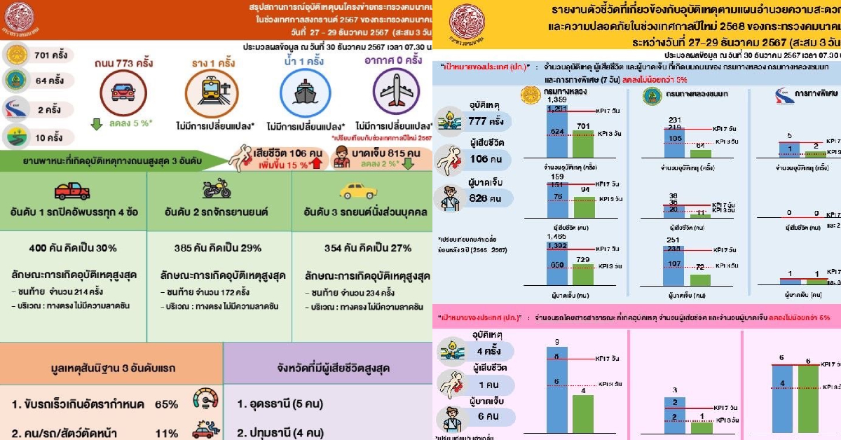 ทั้งนี้ จากข้อมูลศูนย์ปฏิบัติการความปลอดภัยคมนาคม สรุปสถิติอุบัติเหตุบนโครงข่ายของกระทรวงคมนาคม วันที่ 27-29 ธันวาคม 2567 (สะสม 3 วัน) สรุป ณ วันที่ 30 ธันวาคม 2567 เวลา 07.30 น. พบว่าทางบก เกิดอุบัติเหตุรวม 773 ครั้ง, ผู้เสียชีวิต 106 คน, ผู้บาดเจ็บ 815 คน สาเหตุจากขับรถเร็วเกินอัตรากำหนด 501 ครั้ง คิดเป็นร้อยละ 64.81