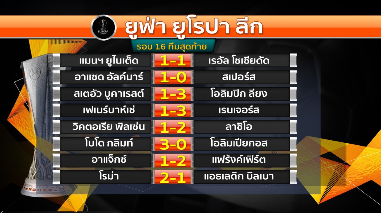 ผลฟุตบอลยูฟ่า ยูโรปา ลีก รอบ 16 ทีมสุดท้าย นัดแรก เมื่อคืนที่ผ่านมา “ปีศาจแดง” แมนเชสเตอร์ ยูไนเต็ด จากอังกฤษ บุกไปเสมอ เรอัล โซเซียดัด จากสเปน 1-1 โดยทีมปีศาจแดง ขึ้นนำก่อน 1-0 ในนาทีที่ 57 จาก โจชัว เซิร์กซี แต่มาเสียจุดโทษจากจังหวะแฮนด์บอลของ บรูโน เฟอร์นันเดส ก่อนที่ มิเกล โอยาร์ซาบัล จะสังหารจุดโทษเข้าไปในนาทีที่ 70 ทำให้แมนฯ ยูไนเต็ด ที่ก่อนหน้านี้แพ้ให้กับ ฟูแลม ตกรอบ 5 เอฟเอ คัพ เมื่อวันอาทิตย์ที่ผ่านมา เหลือลุ้นเพียงแค่ถ้วยยูโรปา ลีก ใบเดียวเท่านั้น จะต้องกลับลุ้นกันต่อในเกมนัด 2 ที่สนามโอลด์ แทรฟฟอร์ด ในคืนวันพฤหัสบดีที่ 13 มีนาคมนี้