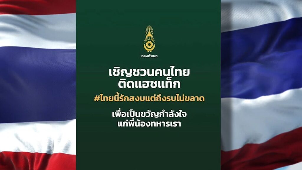6 มิ.ย. – กองทัพบกโพสต์เชิญชวนคนไทยติดแฮชแท็ก “#ไทยนี้รักสงบแต่ถึงรบไม่ขลาด” ให้กำลังใจทหารไทย ขณะที่วันนี้ (6 มิ.ย.) นัดถก ผบ.เหล่าทัพเฉพาะกิจ แก้ปัญหาชายแดนไทย-กัมพูชา