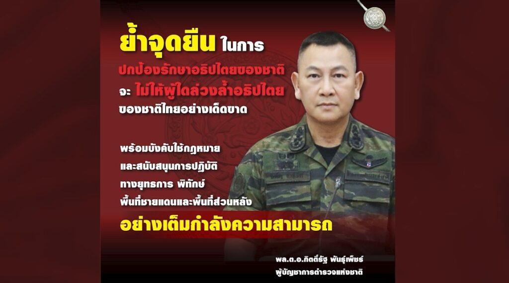 พล.ต.อ.กิตติ์รัฐ พันธุ์เพ็ชร์ ผู้บัญชาการตำรวจแห่งชาติ ยืนยันว่าสำนักงานตำรวจแห่งชาติให้ความสำคัญสูงสุดในการพิทักษ์ปกป้องรักษาชาติ และคุ้มครองอธิปไตยของดินแดนไทย ได้สั่งการให้ตำรวจตระเวนชายแดนเตรียมความพร้อมกำลังและอาวุธยุทโธปกรณ์ พร้อมในการปฏิบัติและสนับสนุนอย่างเต็มที่ และสำนักงานตำรวจแห่งชาติจะสนับสนุนอย่างเต็มกำลังความสามารถ โดยไม่ให้ผู้ใดล่วงล้ำอธิปไตยของชาติไทยอย่างเด็ดขาด