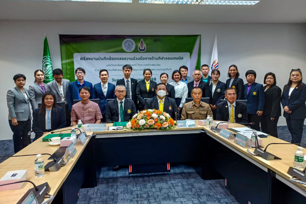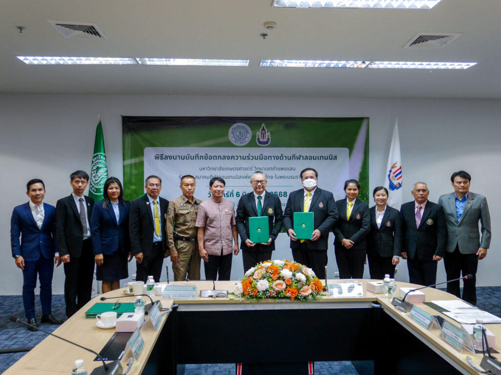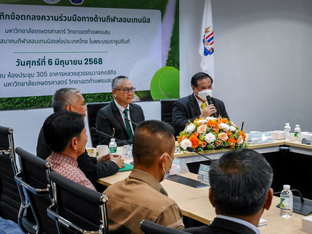 มหาวิทยาลัยเกษตรศาสตร์ วิทยาเขตกำแพงแสน โดย รองศาสตราจารย์ นายสัตวแพทย์ ดร.อนุชัย ภิญโญภูมิมินทร์ รองอธิการบดี ปฏิบัติหน้าที่แทน อธิการบดี ม.เกษตรศาสตร์ กับ สมาคมกีฬาลอนเทนนิสแห่งประเทศไทย ในพระบรมราชูปถัมภ์ โดย นายไทยทนุ วรรณสุข เลขาธิการสมาคมฯ ได้ร่วมกันทำบันทึกข้อตกลงความร่วมมือทางด้านกีฬา ณ ม.เกษตรศาสตร์ วิทยาเขตกำแพงแสน จ.นครปฐม เมื่อวันที่ 6 มิถุนายน 2568 ท่ามกลางบรรยากาศชื่นมื่น โดยมี ว่าที่ร้อยตรี ดร.ศิริชัย ศรีพรหม ผู้ช่วยอธิการบดีฝ่ายบริหาร กีฬา และศิลปวัฒนธรรม กล่าวรายงาน