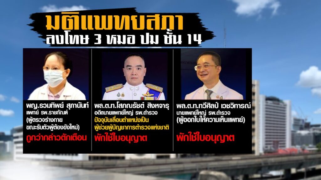 การประชุมลงมติเมื่อเดือนที่แล้ว คณะกรรมการมีมติให้ลงโทษแพทย์ 3 ราย ประกอบด้วย 1.แพทย์หญิงรวมทิพย์ สุภานันท์ แพทย์ รพ.ราชทัณฑ์ ในฐานะแพทย์ผู้ตรวจร่างกาย ขณะรับตัวผู้ต้องขังใหม่ ซึ่งโดนลงโทษตักเตือนเนื่องจากเขียนใบส่งตัวล่วงหน้า พร้อมสั่งพักใช้ใบอนุญาตวิชาชีพแพทย์ 2 ราย คือ พล.ต.ท.โสภณรัชต์ สิงหจารุ เมื่อครั้งเป็นนายแพทย์ใหญ่ รพ.ตำรวจ ปัจจุบันในเลื่อนตำแหน่งเป็น ผู้ช่วยผู้บัญชาการตำรวจแห่งชาติ และ พล.ต.ท.ทวีศิลป์ เวชวิทารณ์ นายแพทย์ใหญ่โรงพยาบาลตำรวจคนปัจจุบัน ในฐานะผู้ออกใบความเห็นแพทย์
