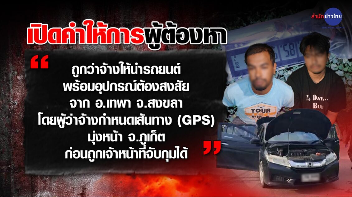 สอบถามชายทั้งสอง ให้การว่าได้รับการว่าจ้างให้นำรถยนต์พร้อมอุปกรณ์ต้องสงสัยดังกล่าว ซึ่งภายในบรรจุสมาร์ตโฟน เชื่อมกับ Pocket WiFi เดินทางจากบ้านสะกอม อ.เทพา จ.สงขลา เมื่อเวลา 19.00 น. วานนี้ (23 มิ.ย.) โดยใช้แผนที่ GPS ที่ผู้ว่าจ้างได้ทำบันทึกไว้ เป็นเส้นทางผ่านจังหวัดสงขลา พัทลุง ตรัง กระบี่ เข้าสู่พังงา มุ่งหน้าภูเก็ต ก่อนถูกเจ้าหน้าที่สกัดและจับกุมได้ก่อน