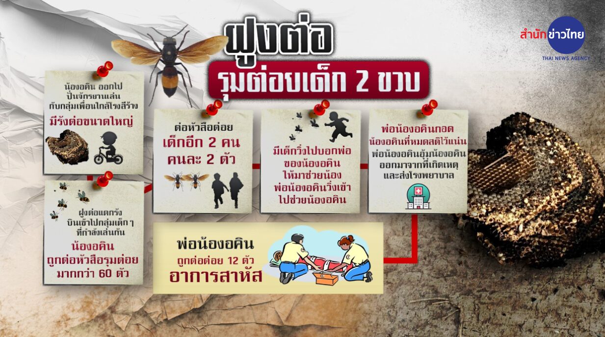 นครราชสีมา 21 ก.ค.- เด็กชายวัยเพียง 2 ขวบเศษ โดนฝูงต่อหัวเสือกว่า 60 ตัวรุมต่อย เสียชีวิต พ่ออาการสาหัส เพราะจังหวะที่เข้าไปช่วย ก็โดนต่อยไปด้วยเหมือนกัน