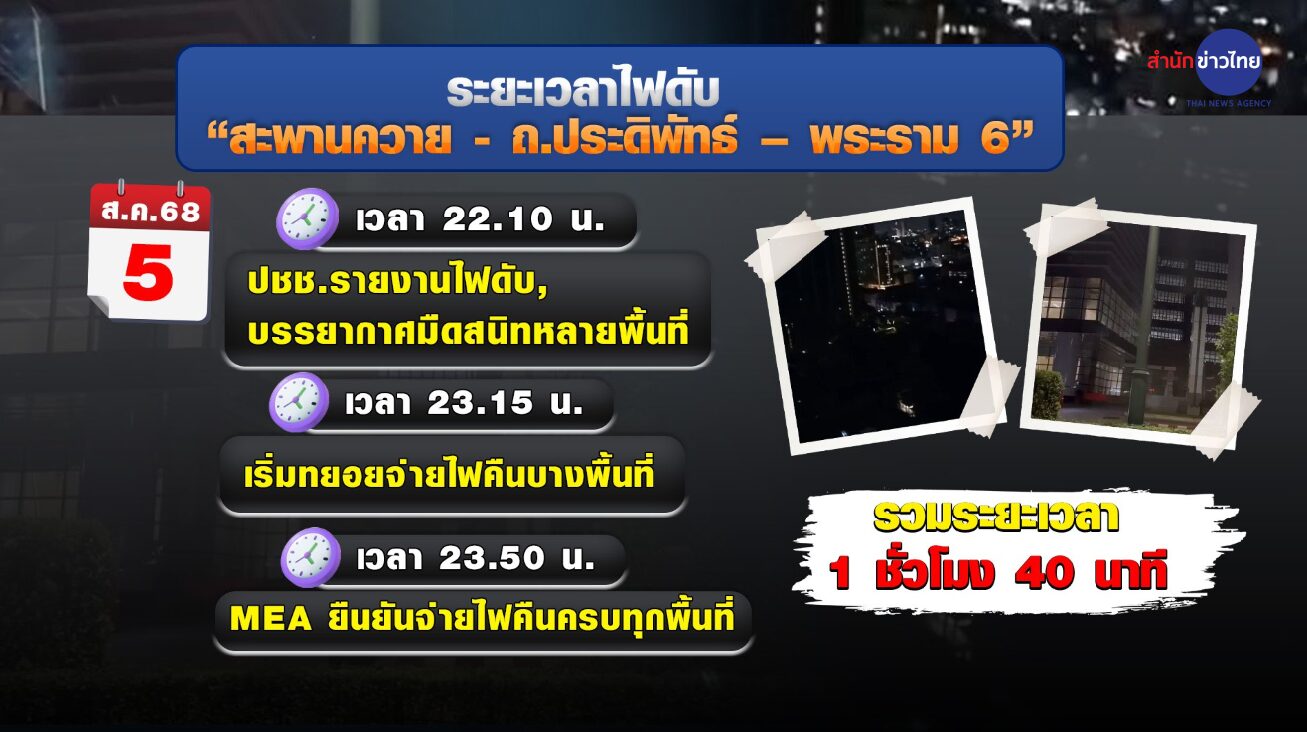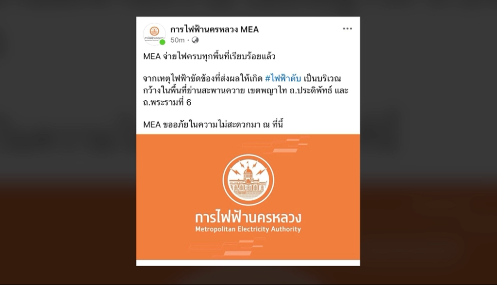 ด้านการไฟฟ้านครหลวง (MEA) รายงานว่า เหตุไฟฟ้าขัดข้องเป็นวงกว้างในพื้นที่ย่านสะพานควาย เขตพญาไท รวมถึงถนนประดิพัทธ์ และถนนพระรามที่ 6 โดยระบุว่า ขณะนี้สามารถจ่ายไฟฟ้าคืนสู่ทุกพื้นที่ที่ได้รับผลกระทบได้เรียบร้อยแล้ว การไฟฟ้านครหลวง ได้เร่งดำเนินการแก้ไขทันทีที่ทราบเหตุ เบื้องต้นคาดว่าเป็นเหตุขัดข้องทางเทคนิคในระบบจำหน่ายไฟฟ้า ซึ่งต้องตรวจสอบเพิ่มเติม การไฟฟ้านครหลวง ขอโทษประชาชนที่ได้รับผลกระทบจากเหตุการณ์นี้ และยืนยันว่าจะเฝ้าระวังและป้องกันไม่ให้เกิดเหตุการณ์ในลักษณะนี้ซ้ำอีก.-สำนักข่าวไทย