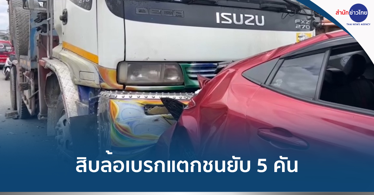 นนทบุรี 26 ก.ย. – รถบรรทุกสิบล้อเบรกแตกพุ่งชนท้ายรถเก๋งและรถกระบะ บนถนนบางกรวย-ไทรน้อย เสียหายรวม 5 คัน บาดเจ็บ 2 คน