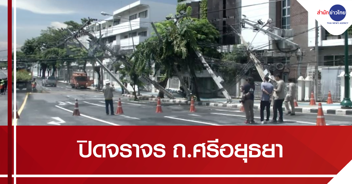 กรุงเทพฯ 5 ก.ย. – เจ้าหน้าที่ปิดการจราจร ถ.ศรีอยุธยา หลังฝนตกลมแรง ต้นไม้หักโค่นพาดเสาไฟฟ้าล้ม 9 ต้น คาดวางเสาเดินสายไฟฟ้าใหม่และเปิดการจราจรได้เช้าวันพรุ่งนี้