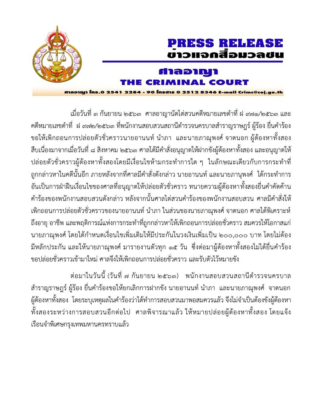 กรณี เมื่อวันที่ 3 กันยายน 2563 ศาลอาญานัดไต่สวนคดีหมายเลขดำ ที่ ฝ ๙๗๑/๒๕๖๓ และ คดีหมายเลขดำที่ ฝ ๙๗๒/๒๕๖๓ ที่พนักงานสอบสวนสถานีตำรวจนครบาลสำราญราษฎร์ผู้ร้อง ยื่นคำร้องขอให้เพิกถอนการปล่อยตัวชั่วคราว นายอานนท์ นำภา และ นายภาณุพงศ์ จาดนอก ผู้ต้องหาทั้งสอง