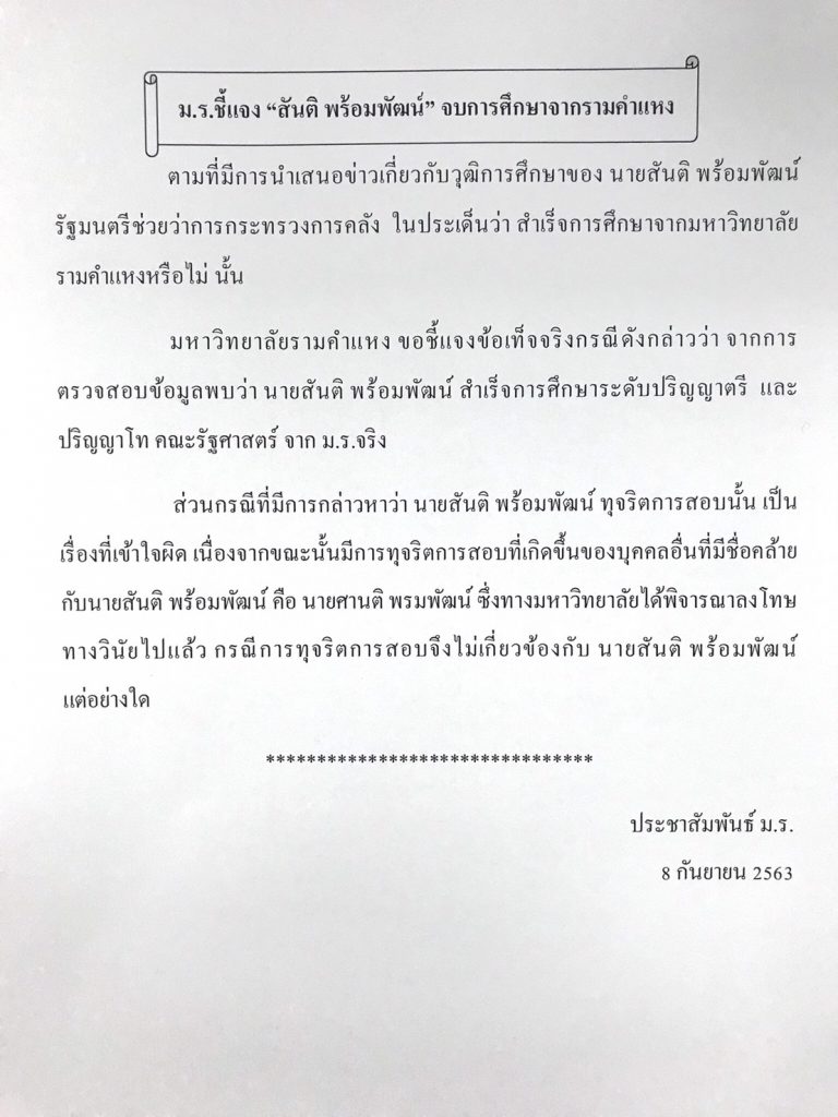 ประชาสัมพันธ์ มหาวิทยาลัยรามคำแหง ออกหนังสือชี้แจงว่า ตามที่มีการนำเสนอข่าวเกี่ยวกับวุฒิการศึกษาของ นายสันติ พร้อมพัฒน์ รัฐมนตรีช่วยว่าการกระทรวงการคลัง ในประเด็นว่า สำเร็จการศึกษาจากมหาวิทยาลัยรามคำแหงหรือไม่ นั้น มหาวิทยาลัยรามคำแหง ขอชี้แจงข้อเท็จจริงกรณีดังกล่าวว่า จากการตรวจสอบข้อมูลพบว่า นายสันติ พร้อมพัฒน์ สำเร็จการศึกษาระดับปริญญาตรี และปริญญาโท คณะรัฐศาสตร์ จาก ม.ร.จริง
