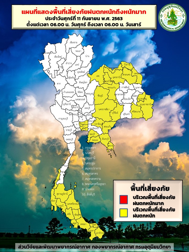 กรมอุตุฯ 11 ก.ย. – กรมอุตุฯ เตือนภาคตะวันออกและภาคใต้ ระวังฝนตกหนักและฝนตกสะสม อาจเกิดน้ำท่วมฉับพลันและน้ำป่าไหลหลาก ส่วนกรุงเทพฯ และปริมณฑล ฝนฟ้าคะนอง 60% ของพื้นที่ และตกหนักบางแห่ง
