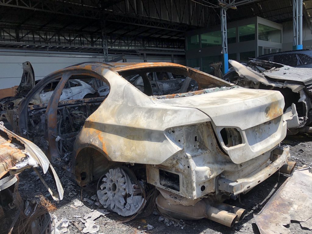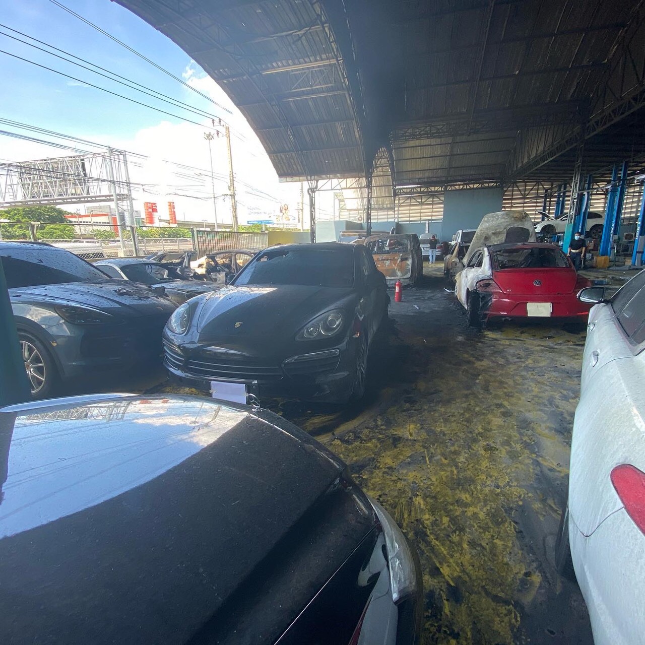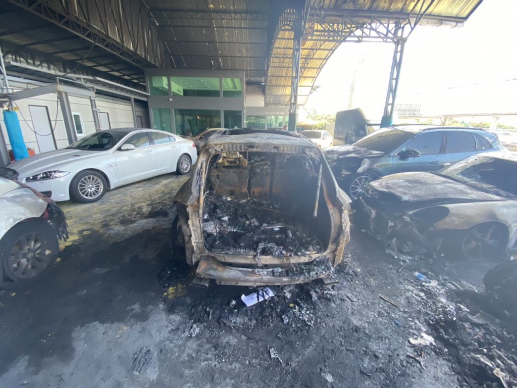เจ้าหน้าที่กองพิสูจน์หลักฐาน เข้าตรวจสอบอู่ซ่อมรถ Phb service ถ.เลียบมอเตอร์เวย์ เขตประเวศที่เกิดเพลิงไหม้เมื่อคืนที่ผ่านมา เบื้องต้นพบว่ารถที่เสียหายทั้งหมดเป็นรถSuper car อาทิ รถ ปอร์เช่ 911 คารเรร่า / เคย์แมน / คาเยน , เบนซ์ s class e class , เบนซ์ วีโต้, จากัวร์ xj , อาวดี้ A8, โฟล์ค บีทเทิ้ล , BMW 523 , โตโยต้า อัลพาร์ท รวมแล้วมูลค่าไม่ต่ำกว่า 30 ล้านบาท จากการตรวจสอบพบว่ารถต้นเพลิงมาจากรถยี่ห้อ BMW โดยเริ่มไหม้จากตัวเครื่องก่อนลุกลามไปยังรถที่จอดอยู่ด้านข้างก่อนลุกลามอย่างรวดเร็ว ขณะเกิดเหตุกล้องวงจรปิดของทางอู่สามารถบันทึกเหตุการณ์ไว้ได้ ไม่พบว่ามีบุคคลใดอยู่ในที่เกิดเหตุ