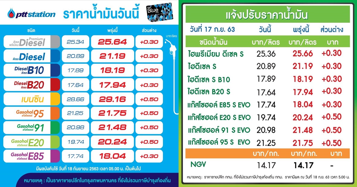 PTT Station. บางจาก ปรับราคาขายปลีกน้ำมันกลุ่มเบนซินทุกชนิดขึ้น 0.50 บาทต่อลิตร เว้น E85 ปรับขึ้น 0.30 บาทต่อลิตร ส่วนกลุ่มดีเซลทุกชนิดปรับขึ้น 0.30 บาทต่อลิตร มีผล 18 ก.ย. 2563 เวลา 05.00 น. เป็นต้นไป โดยราคาขายปลีกจะเป็นดังนี้ เบนซิน 29.16 บาท แก๊สโซฮอล์ 95 อยู่ที่ 21.75 บาท E20 อยู่ที่ 20.24 บาท แก๊สโซฮอล์ 91 อยู่ที่ 21.48 บาท E85 อยู่ที่ 18.04 บาท ดีเซล 21.19 บาท B10 อยู่ที่ 18.19 บาท B20 อยู่ที่ 17.94 บาท และดีเซลพรีเมี่ยม 25.64 บาทต่อลิตร โดยราคาขายปลีกข้างต้นยังไม่รวมภาษีบำรุงกรุงเทพมหานคร.-สำนักข่าวไทย