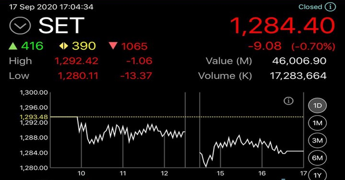 กรุงเทพฯ 17 ก.ย. – หุ้นไทยปิดลบ 9.08 จุด แตะ 1,284.40 จุด