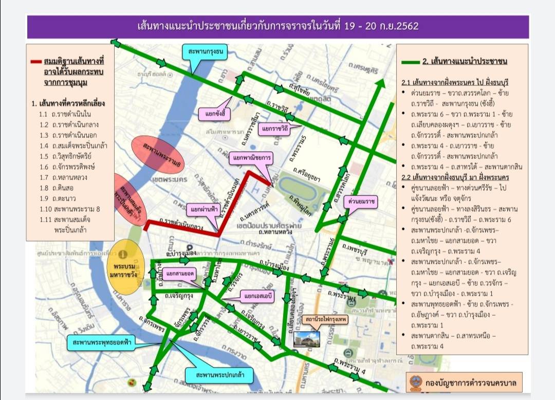 พล.ต.ต.จิรสันต์ แก้วแสงเอก รอง ผบช.น. แนะประชาชนหลีกเลี่ยงเส้นทางการจราจรระหว่างวันที่ 19-20 กันยายน 2563 เนื่องจากจะมีการชุมนุมใหญ่ของกลุ่มธรรมศาสตร์และการชุมนุม และคณะประชาชนปลดแอก บริเวณมหาวิทยาลัยธรรมศาสตร์ ท่าพระจันทร์ และอาจมีการเคลื่อนขบวนไปยังทำเนียบรัฐบาล โดย 9 เส้นทาง 2 สะพาน เส้นทางที่ควรหลีกเลี่ยง ได้แก่ ถนนราชดำเนินใน ถนนหลานหลวงถนนราชดำเนินกลาง ถนนดินสอ ถนนราชดำเนินนอก ถนนตะนาว ถนนสมเด็จพระปิ่นเกล้า สะพานพระราม 8 ถนนวิสุทธิกษัตริย์ สะพานสมเด็จพระปิ่นเกล้า ถนนจักรพรรดิพงษ์