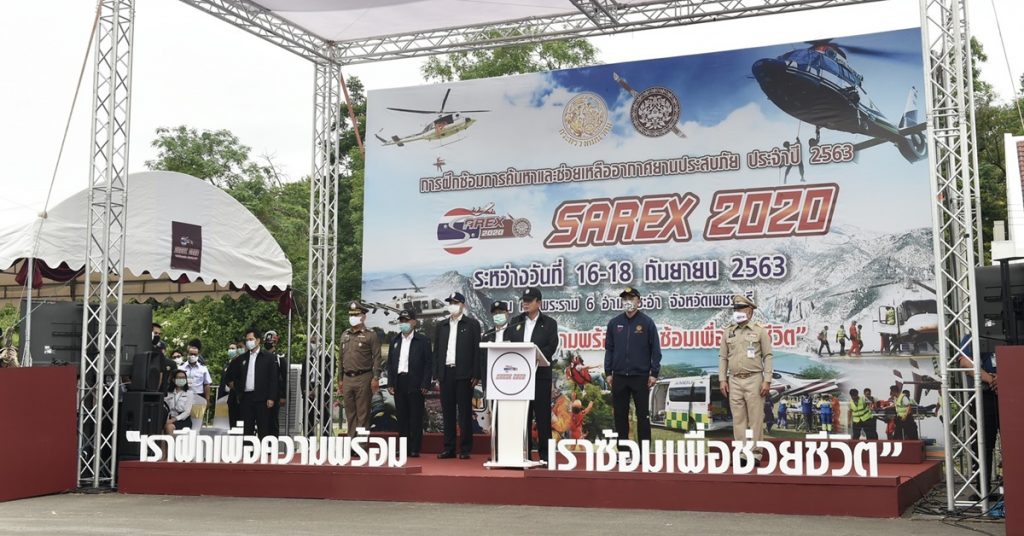 พล.อ.ประยุทธ์ จันทร์โอชา นายกรัฐมนตรีและรัฐมนตรีว่าการกระทรวงกลาโหม เป็นประธานในพิธีเปิดและปิดการฝึกซ้อมการค้นหาและช่วยเหลืออากาศยานประสบภัยปี 2563 หรือ SAREX 2020 ที่ค่ายพระราม 6 อําเภอชะอํา จังหวัดเพชรบุรี เพื่อทบทวนการปฏิบัติงานของเจ้าหน้าที่ให้มีประสิทธิภาพ รวดเร็ว และเป็นไปตามมาตรฐานสากล โดยการฝึกซ้อมเป็นการจำลองเหตุการณ์เสมือนจริงรวมถึงแลกเปลี่ยนประสบการณ์การเรียนรู้ทดสอบและปรับปรุงบัญชีบริภัณฑ์ รวมถึงระบบการติดต่อสื่อสารยกระดับเพิ่มขีดความสามารถสร้างความเชื่อมั่นในการพัฒนาเป็นศูนย์กลางการบินนานาชาติของไทยซึ่งการฝึกเริ่มตั้งแต่วันที่ 16 กันยายน เป็นต้นมา
