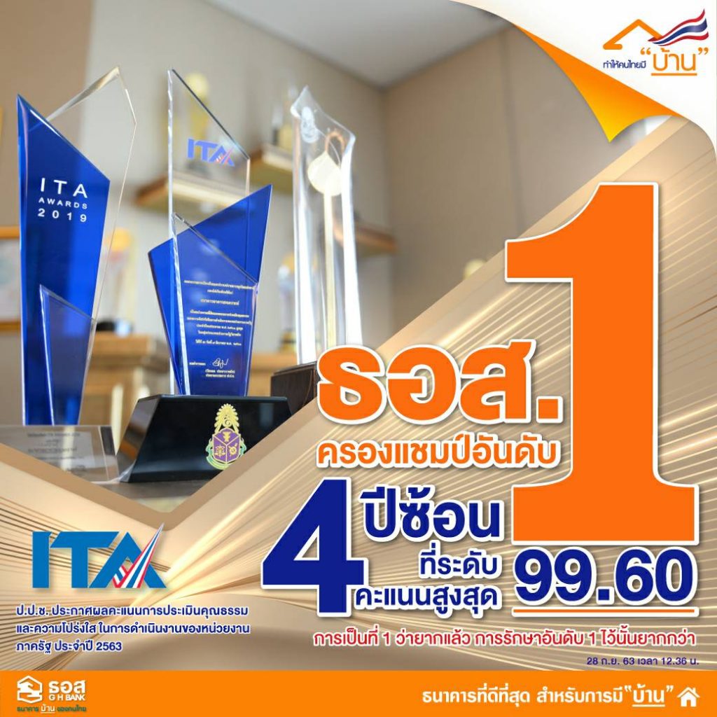 นายฉัตรชัย ศิริไล กรรมการผู้จัดการ ธนาคารอาคารสงเคราะห์ (ธอส.) เปิดเผยว่า สำนักงานคณะกรรมการป้องกันและปราบปรามการทุจริตแห่งชาติ (ป.ป.ช.) ได้ประกาศผลคะแนนการประเมินคุณธรรมและความโปร่งใสในการดำเนินงานของหน่วยงานภาครัฐ (ITA) ประจำปีงบประมาณ พ.ศ. 2563 โดยมีหน่วยงานภาครัฐที่เข้ารับการประเมินทั้งสิ้น 8,303 หน่วยงาน และผลคะแนนปรากฏว่า ธอส. ได้รับคะแนนสูงสุดที่ 99.60 คะแนน อยู่ในระดับ AA และถือเป็นคะแนนประเมินที่สูงที่สุดเป็นอันดับ 1 ต่อเนื่องเป็นปีที่ 4 ติดต่อกัน โดยมีจำนวนผู้มีส่วนได้ส่วนเสียและประชาชนผู้รับบริการหรือติดต่อกับหน่วยงานภาครัฐได้เข้ามามีส่วนร่วมประเมินหรือแสดงความคิดเห็นผ่านการประเมิน ITA จำนวนถึง 1,301,665 คน ซึ่งคะแนนที่ ธอส. ได้รับในครั้งนี้เป็นผลจากการดำเนินงานภายใต้หลักการของ ธอส. ที่เชื่อว่า “Good Result Come From Good Process” หรือผลลัพธ์ที่ดีเกิดจากกระบวนการที่ดี