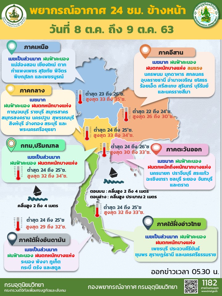 คลื่นลมบริเวณทะเลอันดามันและอ่าวไทยตอนบนมีกำลังแรง โดยมีคลื่นสูง 2-4 เมตร บริเวณที่มีฝนฟ้าคะนอง คลื่นสูงมากกว่า 4 เมตร ขอให้ประชาชนที่อาศัยอยู่บริเวณดังกล่าวระวังอันตรายจากคลื่นลมแรงที่ซัดเข้าหาฝั่ง ชาวเรือควรเดินเรือด้วยความระมัดระวัง และควรงดการเดินเรือ ในช่วงวันที่ 8-10 ตุลาคมนี้ ส่วนอ่าวไทยตอนล่าง ตั้งแต่ จ.สงขลา ลงไป คลื่นสูงประมาณ 2 เมตร บริเวณที่มีฝนฟ้าคะนอง คลื่นสูงมากกว่า 2 เมตร ขอให้ชาวเรือเดินเรือด้วยความระมัดระวัง