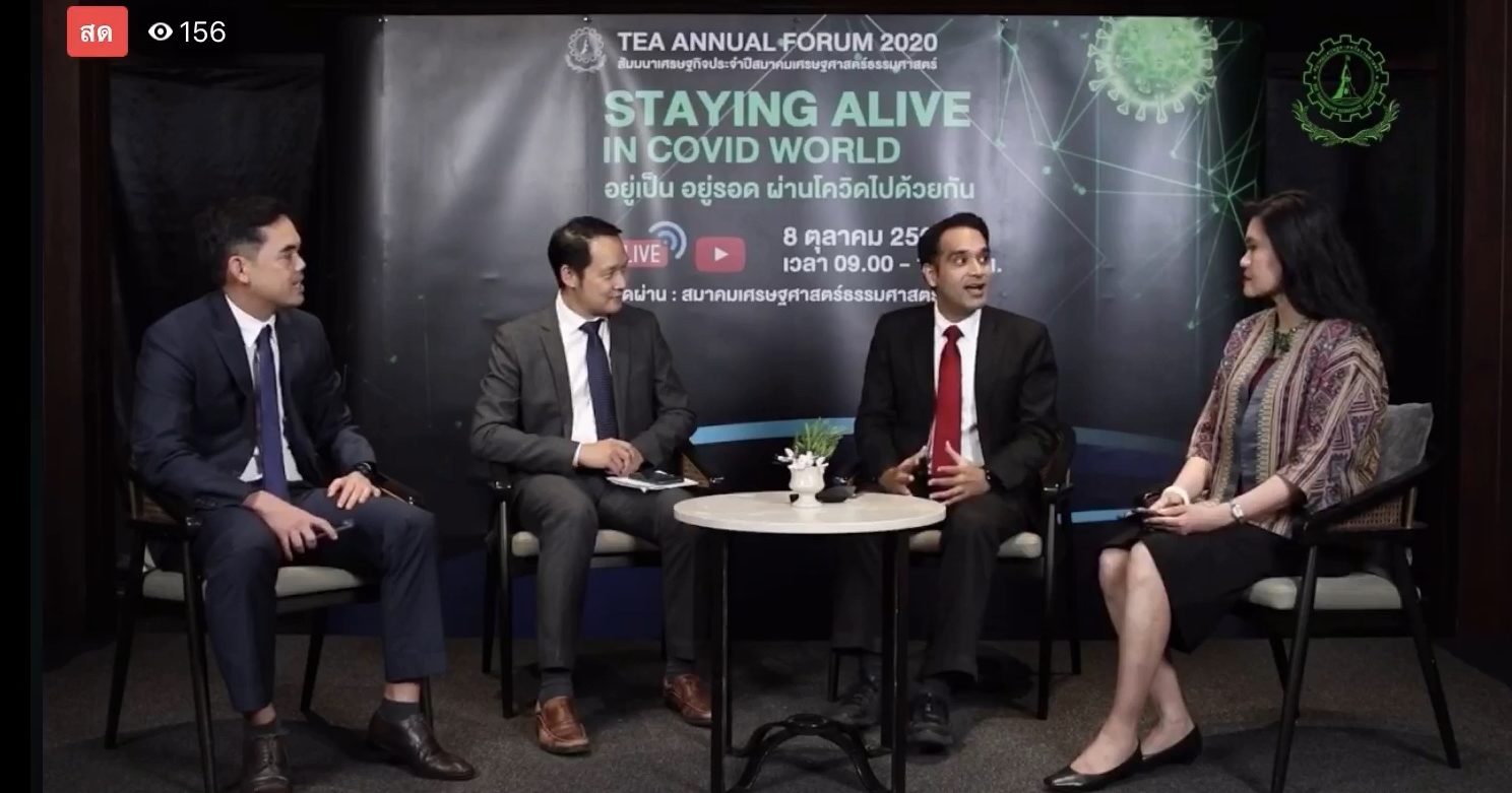 นายอมรเทพ จาวะลา ผู้ช่วยกรรมการผู้จัดการใหญ่ สำนักวิจัย ธนาคาร ซีไอเอ็มบี ไทย กล่าวภายในงานสัมมนาเศรษฐกิจประจำปีสมาคมเศรษฐศาสตร์ธรรมศาสตร์ – TEA Annual Forum 2020 ในรูปแบบออนไลน์ ภายใต้หัวข้อ “อยู่เป็น อยู่รอด ผ่านโควิดไปด้วยกัน” -STAYING ALIVE IN COVID WORLD ว่า เศรษฐกิจโลกมีท่าทีฟื้นตัวได้ดีจากมาตรการกระตุ้นเศรษฐกิจทางการคลังของประเทศสำคัญ มาตรการทางการเงินที่ผ่อนคลาย และการคลายล็อกดาวน์ กำลังซื้อของต่างประเทศเริ่มกลับมาบ้าง การส่งออกเริ่มฟื้นตัวแบบค่อยเป็นค่อยไป เช่น กลุ่มอาหารและอิเล็กทรอนิกส์ กลุ่มเกษตร แต่กลุ่มยานยนต์อาจจะฟื้นตัวช้า ขณะที่ภาครัฐยังมีบทบาทสำคัญในการขับเคลื่อนเศรษฐกิจผ่านการจ้างงานในประเทศ ส่วนค่าเงินบาทในช่วงที่ผ่านมาอ่อนค่าจากปัจจัยต่างประเทศ ส่วนทิศทางค่าเงินบาทในปีหน้ามีโอกาสที่จะแข็งค่า เพราะเราเกินดุลการค้ายังมีอยู่ นอกจากนี้แนะภาคเอสเอ็มอีในการปรับตัว หาจุดแข็ง และออกไปหาตลาดในภูมิภาคอาเซียนเพิ่มเติม