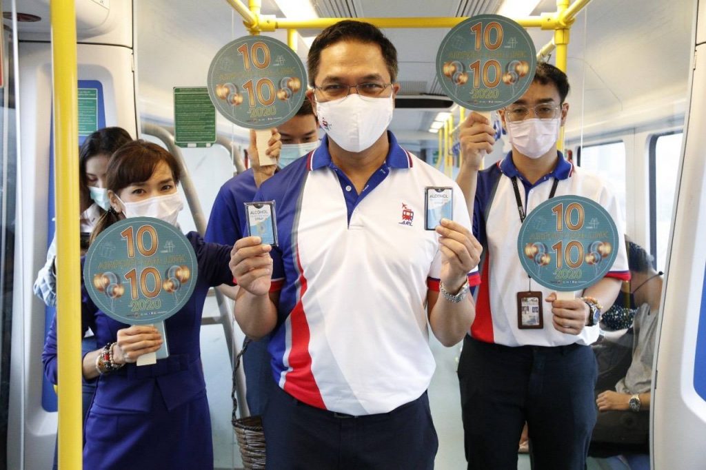 นายสุเทพ พันธุ์เพ็ง กรรมการผู้อำนวยการใหญ่ บริษัท รถไฟฟ้า ร.ฟ.ท. จำกัด ออกแจก Alcohol Hand Cleansing Spray ให้แก่ผู้โดยสารรถไฟฟ้าแอร์พอร์ต เรล ลิงก์ ต้อนรับแคมเปญกิจกรรม “ วันที่ 10 เดือน 10” เฉลิมฉลองก้าวสู่ปีที่ 10 ในการให้บริการ และเพื่อเป็นการสานต่อความห่วงใยในสุขอนามัยของผู้โดยสารที่บริษัทดำเนินการมาโดยตลอด ก่อนที่ในวันที่ 10 ตุลาคม 2563 จะจัดกิจกรรม “ วันที่ 10 เดือน 10” แจก Alcohol Hand Cleansing Spray ให้แก่ผู้โดยสารที่ถือบัตรสมาร์ทพาสของรถไฟฟ้าแอร์พอร์ต เรล ลิงก์ ทุกประเภท ฟรี! แบบไม่จำกัดจำนวนจนกว่าของจะหมด ซึ่งผู้โดยสารสามารถนำบัตรสมาร์ทพาสไปติดต่อขอรับได้ที่ห้อง Information แอร์พอร์ต เรล ลิงก์ สถานีพญาไท ตั้งแต่เวลา 08.00 – 17.00 น. – สำนักข่าวไทย