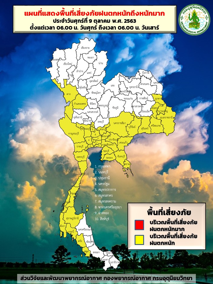 กรมอุตุนิยมวิทยา ออกประกาศเรื่อง “พายุระดับ 1 (หย่อมความกดอากาศต่ำกำลังแรง) บริเวณภาคใต้ตอนบน (มีผลกระทบถึงวันที่ 9 ตุลาคม 2563)” ฉบับที่ 13 ลงวันที่ 9 ตุลาคม 2563 ระบุว่า พายุระดับ 1 (หย่อมความกดอากาศต่ำกำลังแรง) ปกคลุมบริเวณภาคใต้ตอนบน กำลังเคลื่อนตัวทางทิศตะวันตก คาดว่าจะเคลื่อนตัวผ่านภาคใต้ตอนบนเข้าสู่ทะเลอันดามัน ในวันนี้ (9 ต.ค.) ลักษณะเช่นนี้ทำให้มีฝนตกหนักถึงหนักมากบางแห่ง บริเวณภาคตะวันออกเฉียงเหนือตอนล่าง ภาคตะวันออก ภาคกลาง และภาคใต้ ขอให้ประชาชนที่อาศัยในพื้นที่เสี่ยงภัยบริเวณดังกล่าว ระวังอันตรายจากฝนตกหนักถึงหนักมาก ซึ่งอาจทำให้เกิดน้ำท่วมฉับพลันและน้ำป่าไหลหลากได้