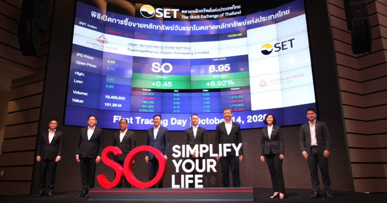 ตลาดหลักทรัพย์แห่งประเทศไทย 14 ต.ค. – บมจ. สยามราชธานี หรือ SO เข้าทำการซื้อขายหลักทรัพย์วันแรก (14 ต.ค.63) ด้วยมูลค่าหลักทรัพย์ ณ IPO 2,015 ล้านบาท โดยราคาเปิดเทรด เหนือจอง 0.25% จาก 6.50 บาท/หุ้น ขึ้นเป็น 6.75 บาท/หุ้น ตั้งเป้าธุรกิจโตกว่าค่าเฉลี่ยต่อปีที่ 7% หลังวิกฤติโควิด-19 หนุนโอกาสทางธุรกิจมากขึ้น