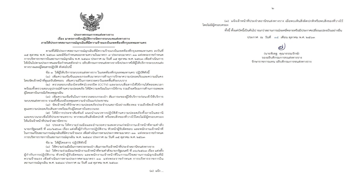 กรุงเทพฯ 15 ต.ค. – กรมรางฯ ออกประกาศมาตรการ ภายใต้สถานการณ์ฉุกเฉินที่มีความร้ายแรงในเขตท้องที่กรุงเทพมหานคร ยกระดับดูแลความปลอดภัยพื้นที่ระบบรถไฟฟ้า