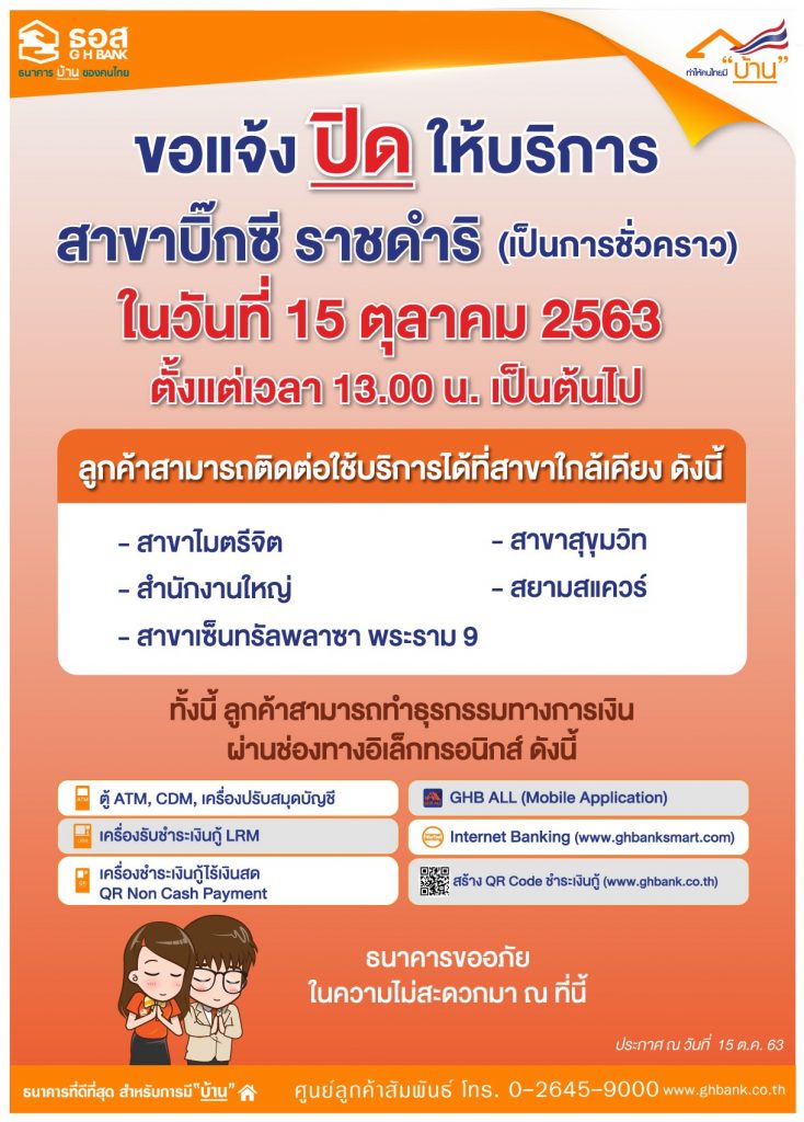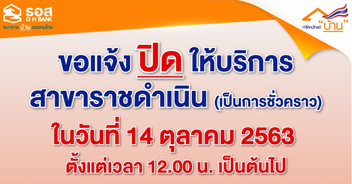 ธนาคารอาคารสงเคราะห์ (ธอส.) แจ้งปิดการให้บริการธุรกรรมทางการเงินทุกประเภทที่สาขาบิ๊กซี ราชดำริ เป็นการชั่วคราว ในวันพฤหัสที่ 15 ตุลาคม 2563 ตั้งแต่เวลา 13.00 น. เป็นต้นไป เนื่องจากเป็นสาขาที่อยู่ในพื้นที่ชุมนุมทางการเมือง ซึ่งอาจทำให้ลูกค้าประชาชนไม่ได้รับความสะดวกในการเดินทางไปใช้บริการ โดยลูกค้าสามารถติดต่อใช้บริการธนาคารได้ที่สาขาใกล้เคียง (สาขาสยามสแควร์ โทร 02-115-1322 ถึง 27, สาขาไมตรีจิต โทร 0-2623-3034 ถึง 8, สาขาสุขุมวิท โทร 02-260-6345, สาขาเซ็นทรัลพลาซา พระราม 9 โทร 0-2160-3426 ถึง 9 และสำนักงานใหญ่ พระราม 9) หรือสาขาอื่น ๆ ที่ท่านสะดวก ทั้งนี้ ธนาคารได้เตรียมความพร้อมในการรองรับการให้บริการ ณ สาขาใกล้เคียง เพื่ออำนวยความสะดวกแก่ลูกค้าทุกท่านแล้ว และหากมีการเปลี่ยนแปลงจะประชาสัมพันธ์ให้ทราบต่อไป สอบถามรายละเอียดเพิ่มเติมได้ที่ศูนย์ลูกค้าสัมพันธ์ โทร 0-2645-9000 และติดตามข่าวสารของธนาคารได้ที่ www.ghbank.co.th หรือ Facebook Fanpage ธนาคารอาคารสงเคราะห์ และธนาคารต้องขออภัยในความไม่สะดวกมา ณ ที่นี้ . – สำนักข่าวไทย