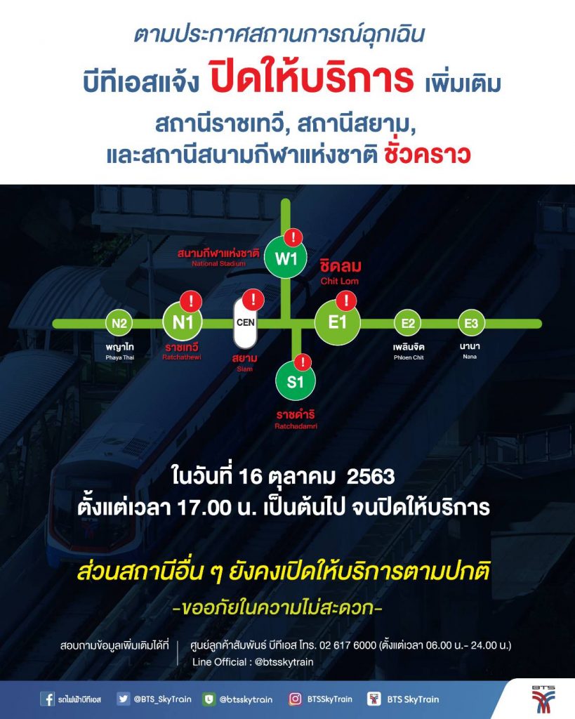 บริษัทฯ จึงขอแจ้งปิดให้บริการชั่วคราว จากเดิม สถานีราชดำริ สถานีชิดลม เพิ่มอีก 3 สถานี ได้แก่ สถานีสยาม สถานีสนามกีฬาแห่งชาติ และสถานีราชเทวี เป็น 5 สถานี ในวันที่ 16 ตุลาคม 2563 ตั้งแต่เวลา 17.00 น. เป็นต้นไปจนปิดให้บริการ แต่ในสถานีอื่น ๆ ยังคงเปิดให้บริการตามปกติ
