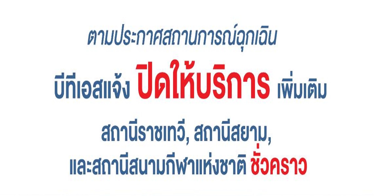 นายสุรพงษ์ เลาหะอัญญา กรรมการผู้อำนวยการใหญ่ บริษัท ระบบขนส่งมวลชนกรุงเทพ จำกัด (มหาชน) หรือผู้ให้บริการรถไฟฟ้าบีทีเอส แจ้งว่า อ้างถึง ประกาศสถานการณ์ฉุกเฉิน ที่มีความร้ายแรงในเขตท้องที่กรุงเทพมหานคร เรื่อง ห้ามการใช้เส้นทางคมนาคม อาคาร หรือสถานที่ โดยอ้างถึงคำสั่งดังต่อไปนี้