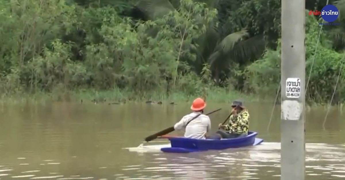 นี่เป็นภาพมุมสูง ซึ่งจะเห็นปริมาณน้ำโอบล้อมหมู่บ้านโป่งประทุน ซอย 10 อ.ปากช่อง จ.นครราชสีมา เจ้าหน้าที่การไฟฟ้าส่วนภูมิภาคปากช่อง ต้องใช้เรือพายเข้าไปตัดไฟ