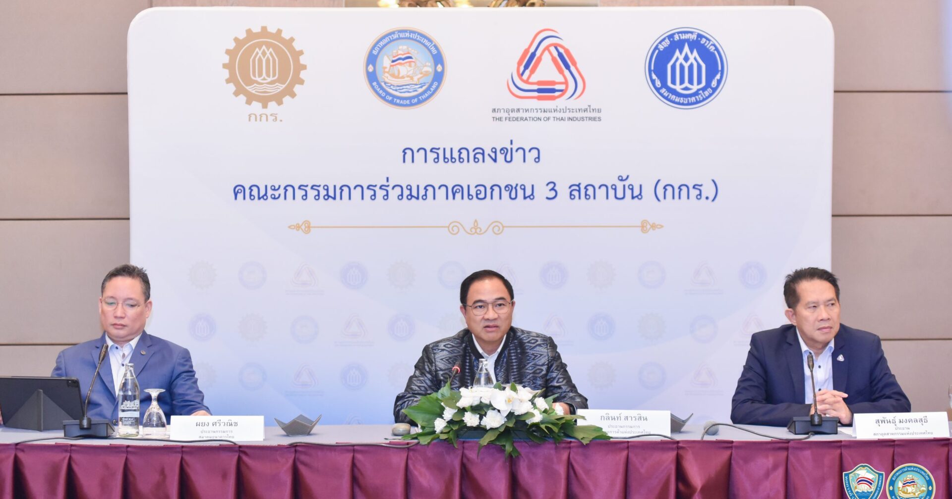 คณะกรรมการร่วมภาคเอกชน 3 สถาบัน (กกร.) โดย นายกลินท์ สารสิน ประธานสภาหอการค้าแห่งประเทศไทย นายสุพันธุ์ มงคลสุธี ประธานสภาอุตสาหกรรมแห่งประเทศไทย นายผยง ศรีวณิช ประธานสมาคมธนาคารไทย ร่วมแถลงข่าวโครงการพักชำระหนี้ที่โรงแรมคอนราด