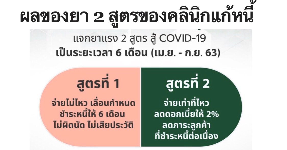 “มาตรการช่วยเหลือที่เรียกว่า “ยา 2 สูตร” หรือ ยาสองขนาน ที่คลินิกแก้หนี้ได้ดำเนินการไปในช่วงเมษายน ถึง กันยายน 2563 ที่ผ่านมา ผลลัพธ์ที่ออกมาถือว่าอยู่ในระดับที่น่าพอใจ กล่าว คือ ลูกหนี้ที่อยู่ในกลุ่มเลื่อนกำหนดชำระหนี้หรือเลือกที่จะใช้ “ยาสูตรที่ 1” มีเพียง 6% แม้ว่าโครงการกำหนดให้เป็นสิทธิสำหรับลูกหนี้ทุกรายที่จะเลื่อนกำหนดชำระหนี้ โดยไม่ถือเป็นการผิดนัดชำระหนี้ ผลที่ออกมาชี้ว่าการลดดอกเบี้ย 2% ถือเป็นแรงจูงใจสำคัญ ที่ทำให้ลูกหนี้ที่มีศักยภาพไม่เลือกที่จะพักชำระหนี้ และยังคงชำระค่างวดเข้ามาตามปกติ