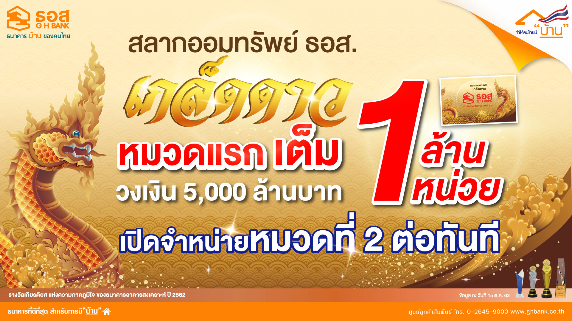 นายฉัตรชัย ศิริไล กรรมการผู้จัดการ ธนาคารอาคารสงเคราะห์ (ธอส.) กล่าวว่า ตามที่ธนาคารได้เริ่มเปิดจำหน่าย สลากออมทรัพย์ ธอส. ชุดเกล็ดดาว หน่วยละ 5,000 บาท กรอบวงเงิน 15,000 ล้านบาท แบ่งออกเป็น 3 หมวด ๆ ละ 1 ล้านหน่วย ตั้งแต่วันอังคารที่ 20 ตุลาคม 2563 นั้น ล่าสุด ณ วันอังคารที่ 27 ตุลาคม 2563 เวลา 16.00 น. พบว่ามีลูกค้าประชาชนซื้อสลากออมทรัพย์ ธอส.ชุดเกล็ดดาว หมวดที่ 1 หมายเลข BA 1000000 – BA 1999999 หมดครบทั้ง 1 ล้านหน่วย หรือคิดเป็นมูลค่า 5,000 ล้านบาท เรียบร้อยแล้ว สะท้อนให้เห็นถึงความคุ้มค่าในการออม การลงทุน และความน่าสนใจของสลากออมทรัพย์ ธอส.ชุดเกล็ดดาว ซึ่งออมหน่วยละ 5,000 บาท แต่มีโอกาสในการถูกรางวัลที่ 1 มูลค่า 1 ล้านบาท/หมวด สูงถึง 0.0045% รวมถึงยังมีรางวัลอื่น ๆ ที่ทำให้ผู้ออมมีโอกาสถูกรางวัลมากยิ่งขึ้น อาทิ รางวัลเลขท้าย 2 ตัว 3 ตัว รางวัลเลขสลับเลขท้าย 2 ตัว และรางวัลเลขสลับเลขท้าย 3 ตัว ซึ่งเป็นรางวัลที่ไม่เคยมีในสลากออมทรัพย์ที่ไหนมาก่อน ทั้งนี้ ธอส. ได้เปิดให้ผู้ที่สนใจซื้อสลากในหมวดที่ 2 จำนวนอีก 1 ล้านหน่วย ตั้งแต่หมายเลข BB 1000000 – BB 1999999 ต่อทันที โดยผู้ที่สนใจสามารถซื้อสลากได้ผ่าน 2 ช่องทาง คือ Application : GHB ALL หรือที่ทำการสาขาทั่วประเทศ และ ธอส. จะนำเงินที่ได้จากการจำหน่ายสลากในครั้งนี้ไปเร่งจัดทำเป็นผลิตภัณฑ์สินเชื่อบ้านอัตราดอกเบี้ยต่ำ เพื่อเป็นทางเลือกให้กับประชาชนในการแบ่งเบาภาระค่าใช้จ่ายในการผ่อนชำระรายเดือน โดยขยายระยะเวลาการกู้ได้นานสูงสุดไม่เกิน 70 ปี กับ “โครงการสินเชื่อบ้าน Two-Gen” ซึ่งจะเริ่มให้ยื่นกู้ในวันที่ 1 ธันวาคม 2563 ต่อไป
