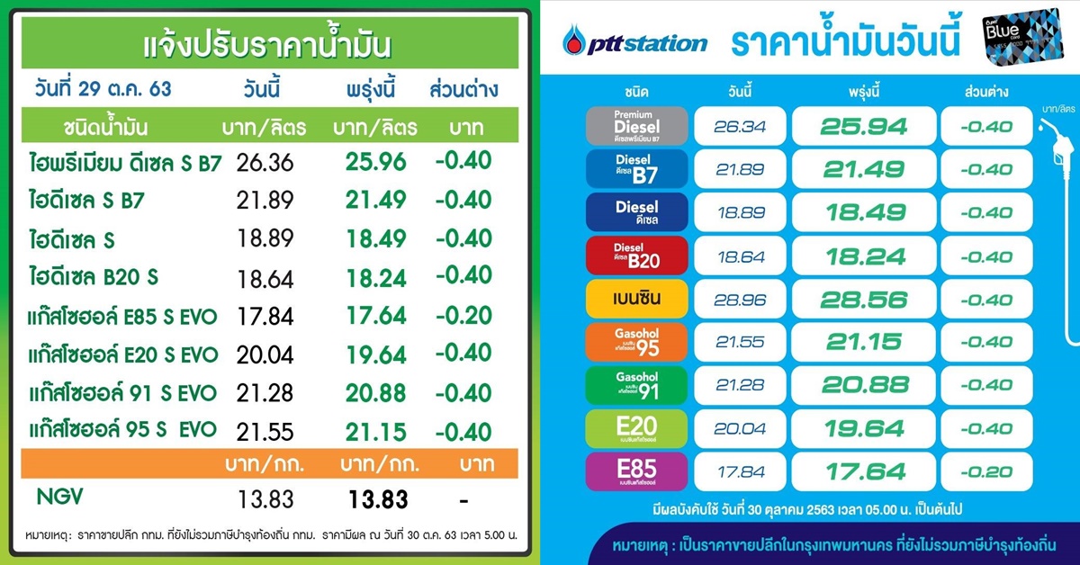 กรุงเทพฯ 29 ต.ค. – ปตท.- บางจาก ปรับลดราคาขายปลีกน้ำมันทุกชนิดลง 0.40 บาทต่อลิตร เว้น E85 ลดลง 0.20 บาทต่อลิตร มีผล 30 ต.ค. 2563 เวลา 05.00 น. เป็นต้นไป