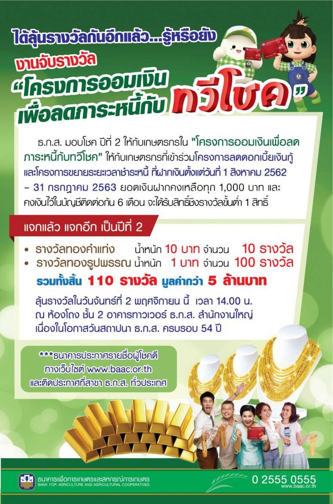สำหรับปี 2563 จะเป็นการมอบโชคในรอบที่ 2 จะมีการจัดงานจับรางวัลในวันที่ 2 พฤศจิกายน 2563 ในช่วงวันสถาปนาครบรอบ 54 ปี ธ.ก.ส. โดยมีผู้เข้าเกณฑ์และได้รับสิทธิ์จับรางวัลจำนวน 381,888 ราย รวมจำนวนเงินออมกว่า 6,900 ล้านบาท และสิทธิ์ที่ร่วมลุ้นโชคกว่า 6.9 ล้านสิทธิ์ ซึ่งของรางวัลในครั้งนี้ประกอบด้วย รางวัลทองคำแท่ง น้ำหนัก 10 บาท จำนวน 10 รางวัล และรางวัลทองรูปพรรณ น้ำหนัก 1 บาท จำนวน 100 รางวัล รวมทั้งสิ้น 110 รางวัล มูลค่ากว่า 5 ล้านบาท . – สำนักข่าวไทย